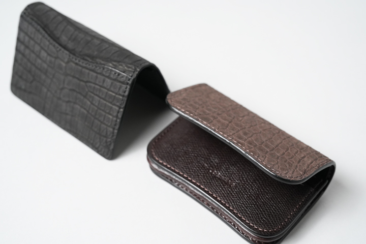 名刺入れはマチ付きタイプと薄型タイプの2種類が揃っています。ヌバックポロサスの名刺入れともなると、さすがに風格のある佇まいです。
