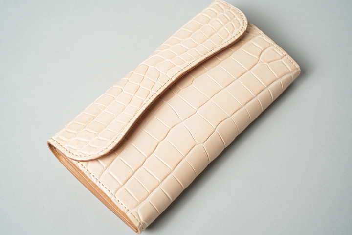 無染色の皮革同士を組み合わせたクロコダイル/WAVE。乳白色のクロコダイルからは、普段のイメージと離れた無垢(むく)な印象を受けます。軽やかなカラーリングの一方で、しっかりと繊維密度の詰まった重厚感も備えており、エイジングによる色味の変化をたっぷりと堪能できるアイテムです。