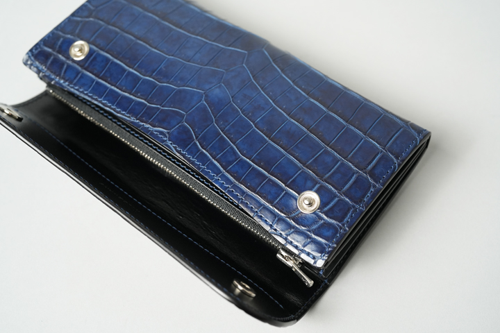 絶妙なデニムカラーの藍染クロコダイルを使用したWAVE。鮮やかで深みのある青色にほんのりと紫色が混ざり、天然の藍ゆえに複雑で奥行きのあるカラーリングに仕上がっています。紫外線との反応によっても色味が変化するため、使用環境によってさまざまな様相に変わるエイジングをお楽しみいただけます。