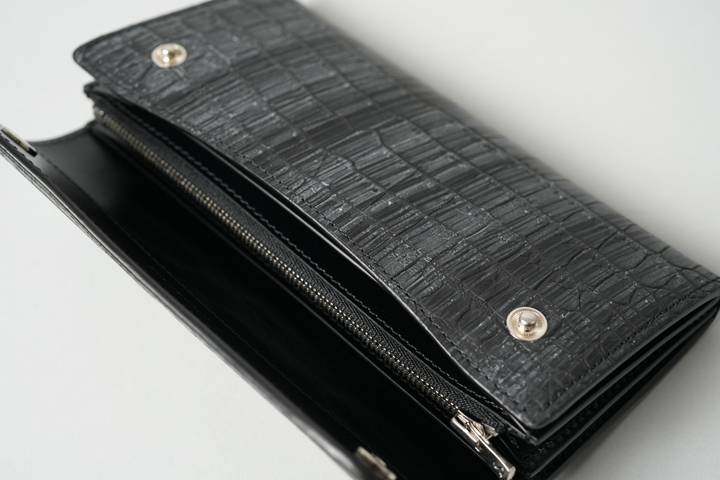 ここからはシリーズの垣根を超えて、特別なクロコダイルを使用した大型長財布・WAVEをご覧いただきます。ずば抜けた板面を有するWAVEはクロコダイルの迫力が最大限に生かされ、他製品とは一線を画す圧倒的な存在感を放ち、もはや芸術品とも呼べるような貫禄があります。