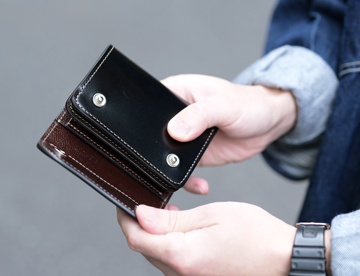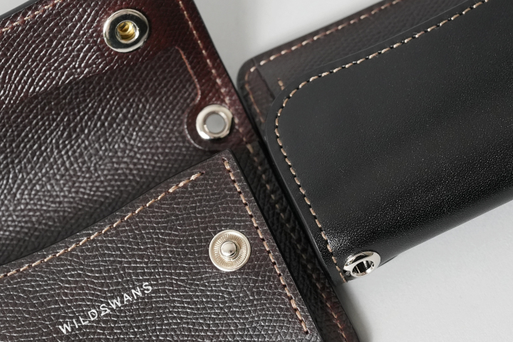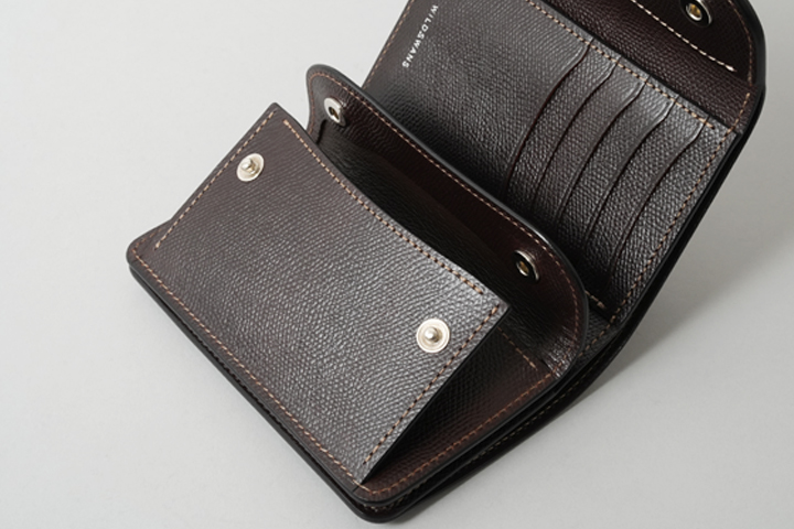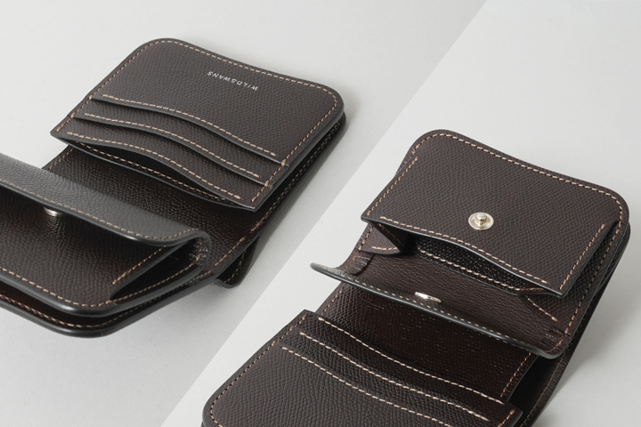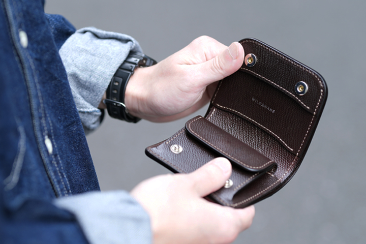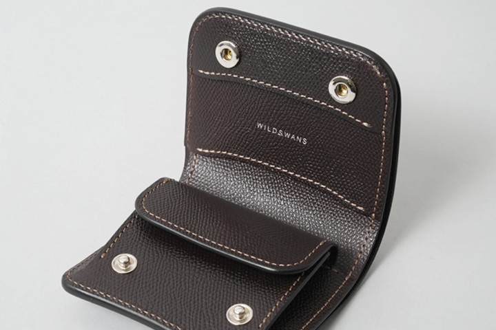 最小のお財布としても使用可能な、取り回しの良いコインケースです。背面に設けられたカードポケットにはプラスチック製のカードが1枚収納可能なため、使用頻度の高いカードを収納してお使いください。ホックを解除してフラップを開くと、コインケース部分が顔をのぞかせます。コインケース部分に備えられた仕切りを利用して、硬貨を仕分けたり、仕切りの背面側に3つ折りにした紙幣を収納することも可能です。さらにこちらのモデルにはハトメが設けられているので、カラビナやウォレットチェーンをつなげる他、長めのストラップをつなげて首から下げるなどフレキシブルにお使い頂けます。