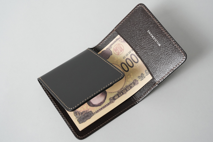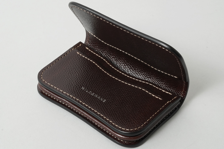 金具を使わずに革で紙幣を挟み込むマネークリップです。 WILDSWANSのロゴが刻印されたポケットに紙幣を差し込み、あおりポケットが配置された側を紙幣に被せるように折り畳み、ロゴ入りポケット側をさらにその上に折り畳みます。 非常に薄いつくりになっていますので、胸ポケットなど収納場所を選びません。
