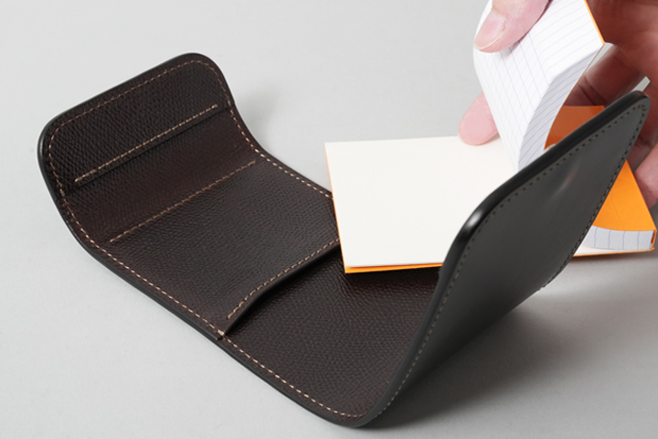 フランスのクレールフォンテーヌ・ロディア社のブロックロディアNo.11専用のカバーです。ブロックロディアをぐるっと1周包み込み、ブロックロディアを様々な外的要因から守ります。裏表紙を差し込むポケットにはめくった表紙も差し込むことが出来るので、フラップを開けてすぐにメモを取ることが出来ます。