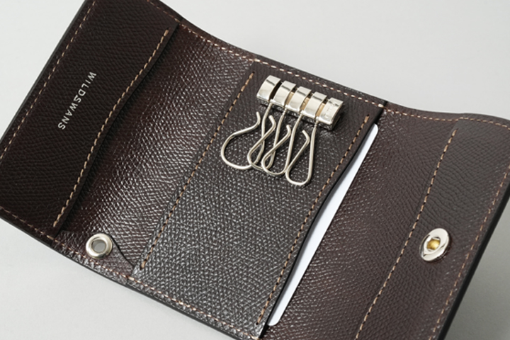 手のひらサイズの丸みがかわいらしいキーケースです。フラップに備えられた2点のホックを解除してフラップを開くと、内装にはamiet社の4連キーフックが取り付けられています。こちらは小のキーフックが3つ、大のキーフックが1つから構成されているため、様々な鍵に対応します。キーフックの下部にはハトメが備えられていますので、カラビナやチェーン、ストラップを接続して頂ければ、使用シーンの幅がぐっと広がります。