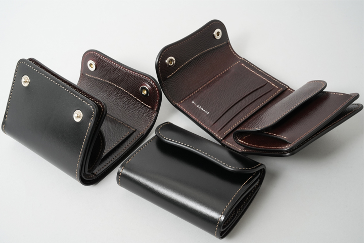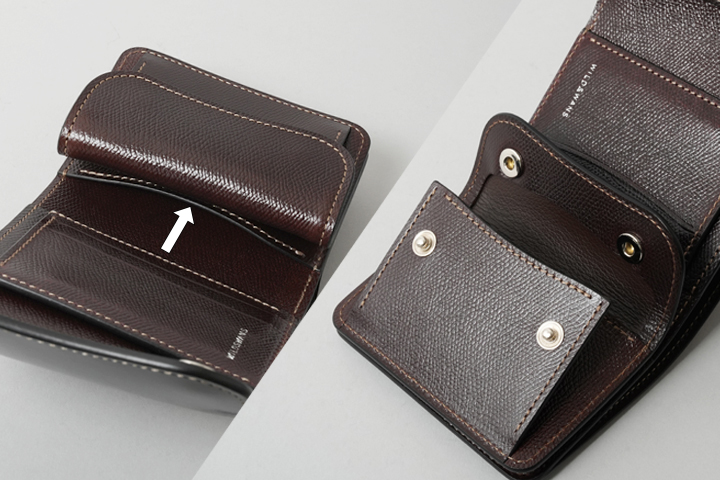 収納力に優れたオールインワンの3つ折り財布です。全体をぐるっと覆う外装を2点のホックでしっかり留めることにより、型崩れを防ぎます。内装の中央に位置するカードポケットユニットは、縦方向に5段のポケットが並び、その背面には左右からアクセスするポケットを1室ずつ備えています(画像内の矢印)。内装の右側に位置するコインケースはENOと同じ構造ですが、大きさの違いに伴いさらに収納量がアップしています。コインケースの右サイドに位置する札室はENOよりも深さに余裕がありますので、紙幣の他に領収書の収納にも優れています。