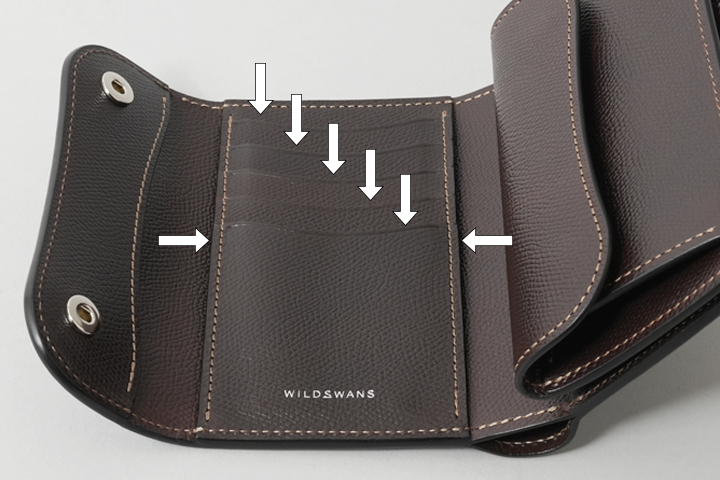 手に持った際の丸みがかわいらしい3つ折り財布です。コバが年輪のように見える様子は、パーツやユニットが多層に重なる3つ折り財布ならではの仕様です。内装の中心に位置するカードポケットユニットには、縦横3方向から収納するポケットが5室備えられています(画像内の矢印)。内装の右側にはTONGUEを思わせるコインケースが付属しています。なお、コインケースの背面にもカードポケットが1室ございます(画像内の矢印)。札室はコインケースの右サイドに用意されています。長さ、深さ共に余裕がありますので、紙幣を数十枚収納してもしっかりと収まります。