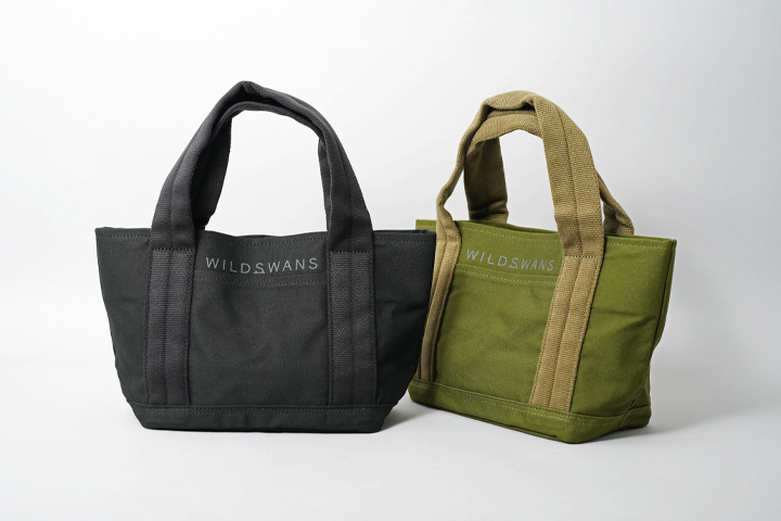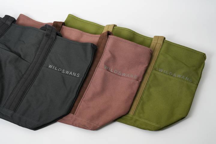 WILDSWANSでは畳んで持ち運べるエコバッグの取り扱いがいくつかございますが、今回はコットンキャンバス(11号帆布)を使用しているバッグをご紹介いたします。 外装は11号帆布、内装は撥水加工を施したポリエステルを採用している、軽量かつ耐久性の高いバッグです。ハンドルには心材を用いて程よい厚さを出しており、持ち運ぶときに手触りが良く、大きなLサイズでは重い荷物を肩にかけたまま過ごしても疲れにくい仕様です。さらにハンドル部分にメインカラーそれぞれに近しい別のカラーを採用することでデザイン性を高めています。その他主な共通の仕様として、外装にあるオープンポケット、内装に中身が見えにくくなるようにするホックなどがあります。