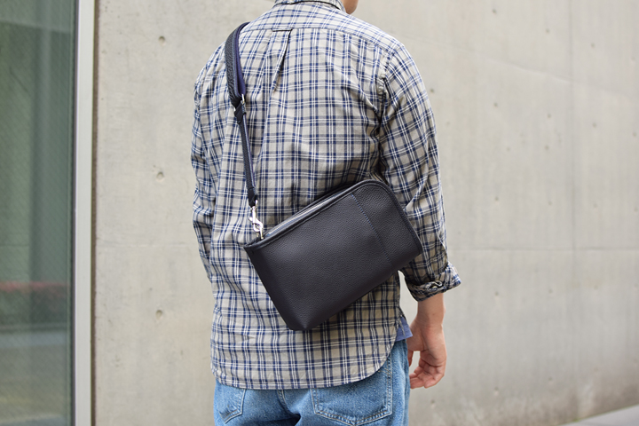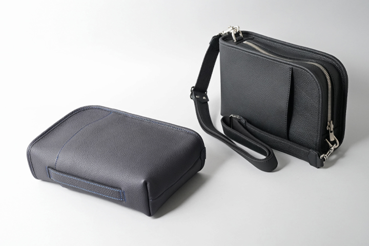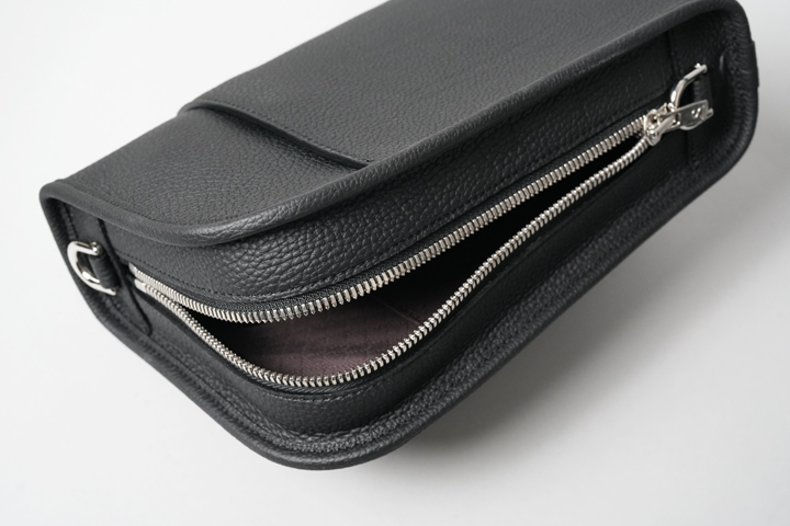 SOLONのメイン収納部はL字ファスナーの開口部になっており、WILDSWANS製品で大型の財布であるWAVEも持ち運ぶことが可能です。内装はDRUCKERと同じくオリジナルコットン生地を使用しています。さらに外装、内装にマチなしポケットもありますので、お出かけに必要なアイテムは余裕を持って収納ができます。シュランケンカーフと生地テープ貼り合わせて製作したショルダーストラップは88~135cmまで調整が可能です。カジュアル一択かと思いきや、ショルダーストラップを取り外せばクラッチバッグへ早変わりしますので、フォーマルな服装の日にも使用できるマルチなバッグです。