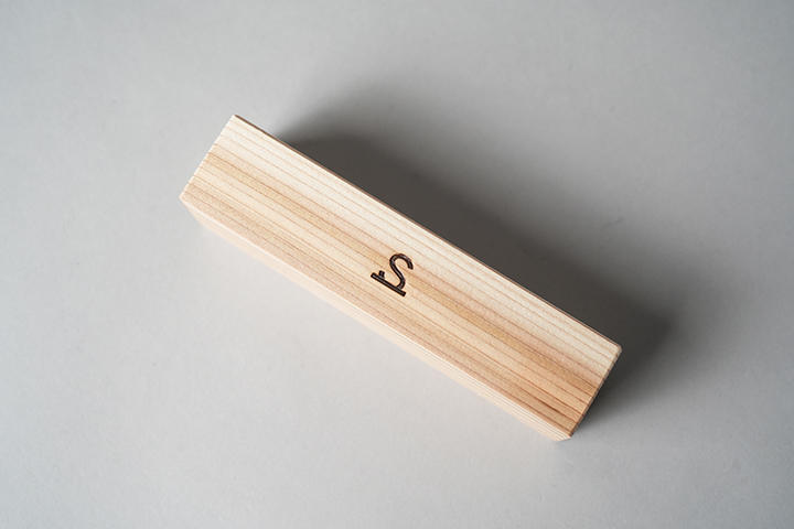 本体の正面にはWILDSWANSのSロゴが刻印されています。新木場の老舗材木問屋から取り寄せた国内の天然の杉に刻印されるロゴマークは、レザーの刻印とは違った迫力があります。