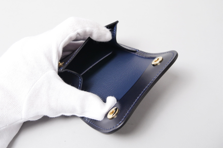 The coin compartment is designed with generous space in mind, featuring gussets on both sides that enhance its overall capacity. This thoughtful design ensures you can store a substantial amount of coins without worry. In the accompanying image, you can see the deep, rich navy color that adds a touch of elegance and sophistication to the overall aesthetic.