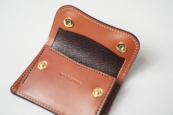 一方で、こちらはWILDSWANSが理想とするコードバンを追求して生まれた、ブランドのオリジナルコードバンです。油分の含有を抑えてハリ感を強めた仕上げと、使い始めのややマットな表情から、ご自身でじっくりと皮革を育てていくことができる育て甲斐のある皮革となっています。また特殊な鞣しの方法を用いることでコードバンの表層の強度を高め、水気や傷に強い特性を持たせています。もちろん全く水を吸わない、傷が付かないといったものではございませんが、コードバン革を扱ったことがないといった方にもおすすめできる皮革です。