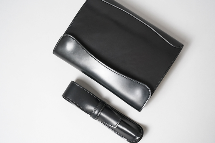気品ある紳士的なブラックカラーのステーショナリーです。シェルコードバンにてステーショナリーを製作する機会は少ないため、お探しの方はぜひご検討ください。