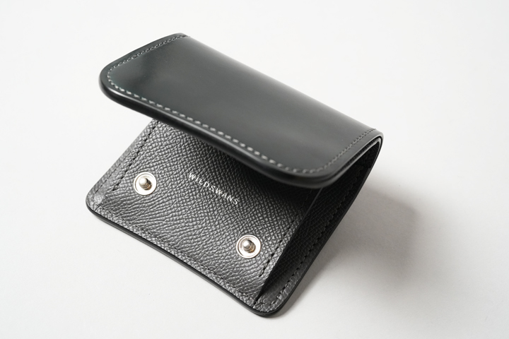人気ミニウォレットのPALM-V2を、シェルコードバン×ダービーの珍しい組み合わせで製作しました。深く渋い組み合わせに、ステッチのチャコールグレーがよく馴染みます。ホックとロゴをシルバーカラーで揃えることで、沈んだ印象のない洗練された風合いに仕上がっています。