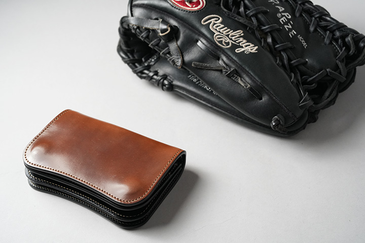 皮革業界においてコードバンといえば、まず名前が挙がるのがアメリカの名門タンナー・ホーウィン社の手がける”シェルコードバン”です。いくつもの工程と約6か月という長い期間を経て、シェルコードバンは製造されます。熟練の職人の手によって生み出されたそれは美しく滑らかな光沢を帯び、同時にずば抜けた堅牢性を持つことから「革のダイヤモンド」とも称されます。水気や汗には繊細な一面もありますが、それらをできるだけ避けてエイジングを遂げた品は、まるで芸術品のような風格すら感じられます。