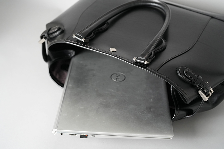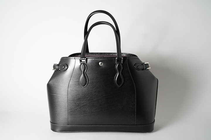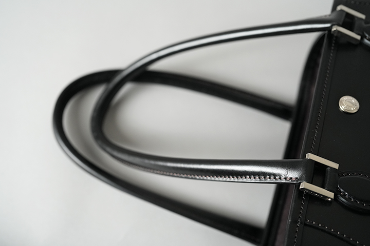 続いてDRUCKERの基本的な仕様についてご説明させて頂きます。いくつかのパーツに分かれていますが、本体の外装は大きく皮革を裁断したパーツを大胆に組み合わせています。ハンドルは男性でも余裕を持って肩掛けができるサイズに設定しています。デザイン的なアクセントにもなっているハンドル根革部分の金具はネジで留める構造になっています。新品時はかなりきつくネジを締めていますが、使用していくとネジに緩みが出る場合があるので、思わぬネジの落下を防ぐためにも少なくとも半年から1年に一度程度はマイナスドライバーを用いてネジの緩みがないか確認して頂くことをお勧めします。ハンドルと本体を繋ぐ根革部分は本体で使用するメイン素材のサドルプルアップを複数枚重ねて組み上げたパーツですが、沢山の荷物を収納しても問題が生じないようにがっしりと作られるています。また、DRUCKERの顔を形作る重要なパーツの一つです。この2つの根革の間には大変強力なホックが取り付けられています。次に本体の両サイドにはベルトが付属されます。通常こちらのベルトを締めた状態で使用しますが、ベルトを締めることで本体の側面に窪みが生まれる他、正面から見た時にもスタイリッシュな出で立ちとなります。なお、荷物が多い時や大きなものを収納する際はこちらのベルトを解除して使用することも可能です。また、ベルトにはそれぞれWILDSWANSオリジナルの金具が付属しますが、こちらの金具とベルトが見える面がDRUCKERの正面となります。本体の下部には安定性と強度に寄与する当て革をくるっと一周分巻いています。こちらは「はかま」と呼ばれる熟練した職人のみが成せる特殊な製法です。そして、底面にも本体と同じ素材の皮革パーツを組み合わせています。こちらには5つの底鋲(そこびょう)をあしらい、床や地面に皮革が直接触れないような仕様に仕上げています。こうして本体下部にもおいても頑強に製作されたDRUCKERは、しっかりと自立をします(ご使用環境などにより使用していくと自立しなくなるケースもございます。)。ハンドルも立てて保管ができるので、出かける時にサッと持ち運べる形状で保管できるのはうれしいポイントです。