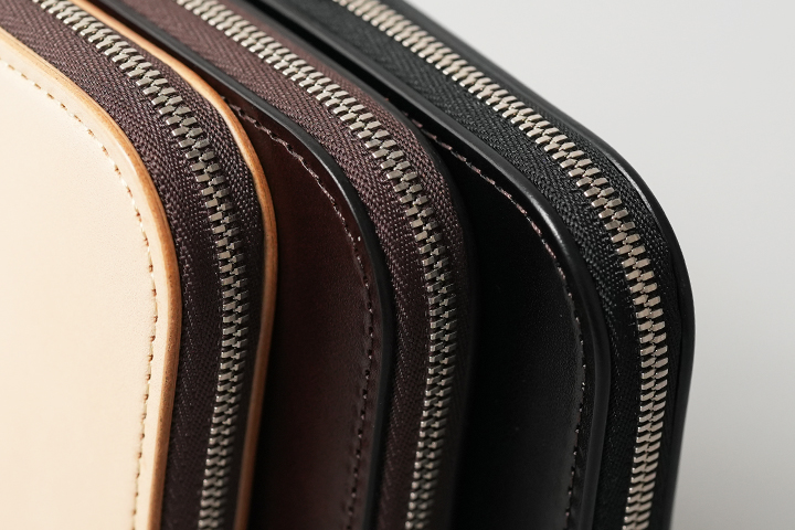 一回のアクションで開閉が出来るという手軽さと、ファスナーによる開閉の安心感、また本体を開いた状態で全ての収納部にアクセス出来る構造によって物の出し入れもスムーズなモデルです。