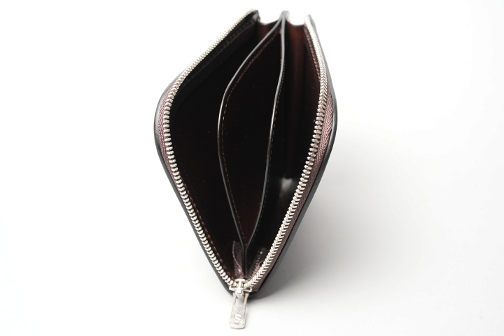 その名の通り隣接する2辺がLの文字のようにファスナーになっており、このファスナーで開閉するタイプのお財布です。