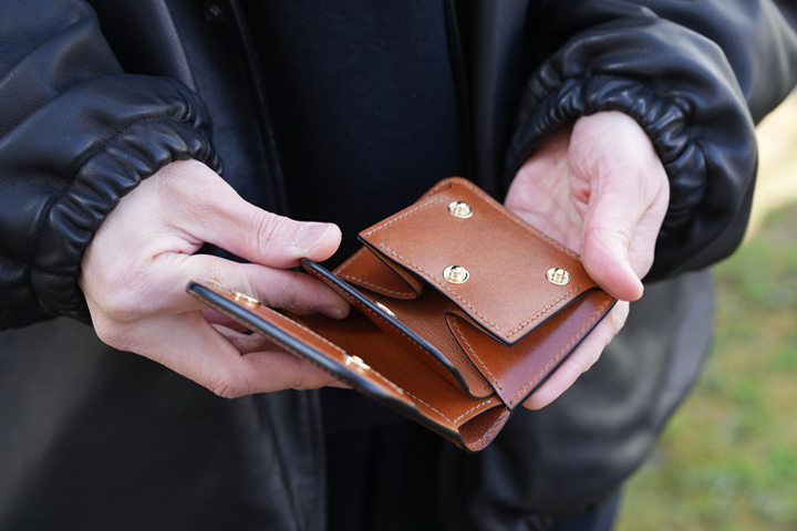 折り畳んだお札やカードも収納できるマルチなコインケース。ハトメが付属することで使用シーンがぐっと広がります。