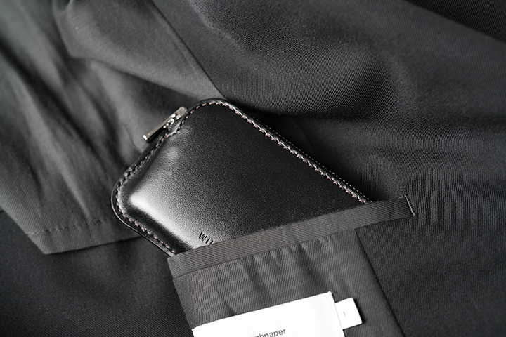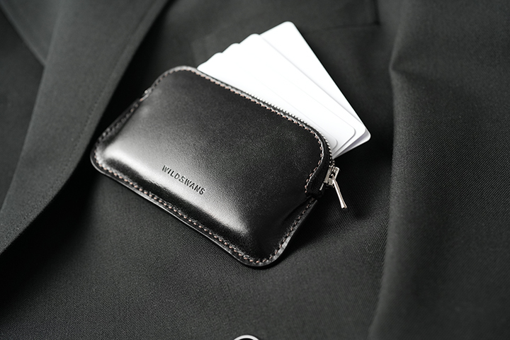 MINASの外観は非常にミニマルなディテールです。本体の底にかけて両サイドにやや広がる形状です。外装の2枚のパーツを合せたコバ部分は他のWILDSWANS製品と同じように、熟練の職人たちの技が光る仕上がりです。WILDSWANS製品の中でも最小の部類に入るMINASですが、こちらのコバによりWILDSWANSらしい力強さが備わります。MINAS唯一の収納部は底から膨らみを持たせた形状により見た目以上の収納量があります。また、本体上部から左右両サイドまで伸ばしたファスナーにより、中身の視認性や取り出しやすさも意識して設計されています。こちらのファスナーは、こちらもWILDSWANSではお馴染みのYKK社のエクセラファスナーです。内部にはプラスチック製のカードが6~15枚収納可能です。(カードの種類や革の馴染み具合により、収納枚数が変動します。)