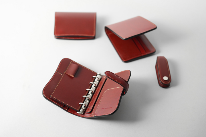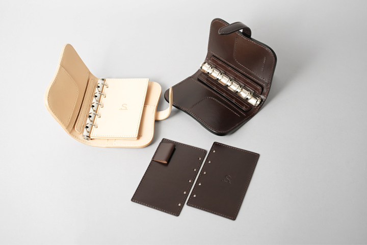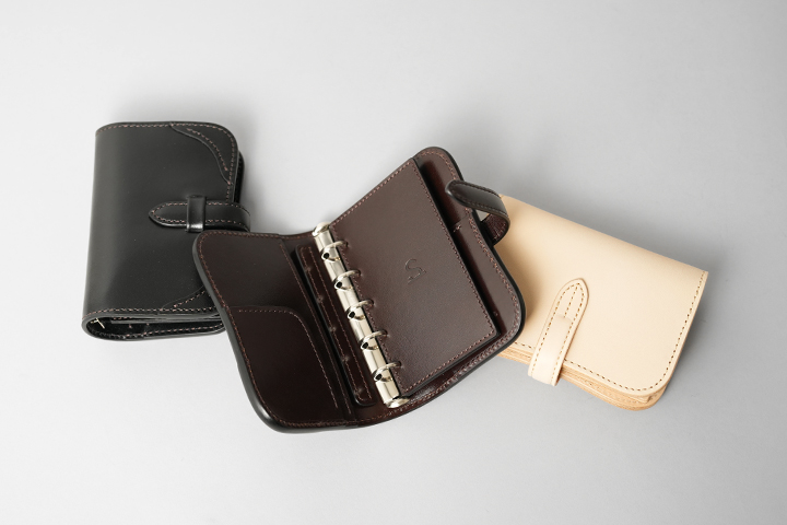このSTATIONERY FAIRにてWILDSWANS製品の仲間入りとなる手帳カバー「VERSE(バース)」。コンパクト財布や二つ折り財布ほどのミニマムな手帳カバーで、マイクロ5(M5)やミニ5穴といった名称で展開されているサイズです。手持ちで書きやすく持ち運びやすさも十分、市販のレフィルで自由にカスタマイズができるのも魅力のひとつです(ミニ5穴用のレフィルをご用意ください(W61×H105mm))。 画像右のシステムバインダー手帳カバー・BIBLE(バイブル)、画像中央のミニ6穴サイズ用のGENESIS(ジェネシス)とほぼ同様の設計で、可愛らしい見た目ながらも頑強で迫力があります。角の丸みやその補強、革製のベルトデザイン、内装のリング部のアタリを抑える革パーツなど、ブランドらしさそのままに仕上がっています。