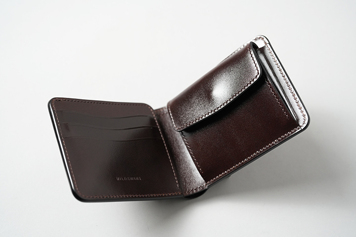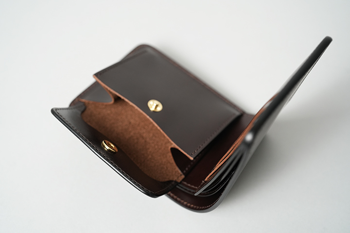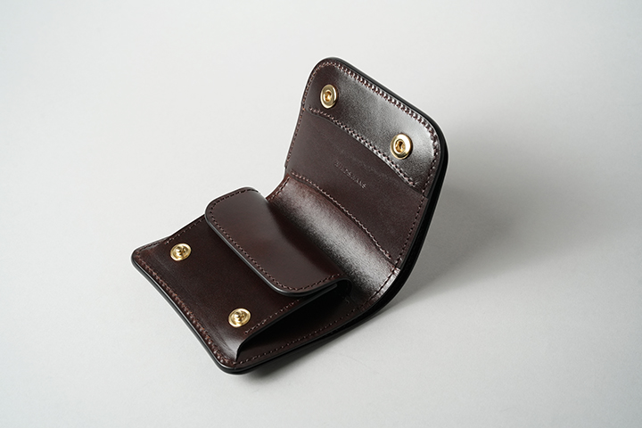 今回のラインアップの最後に登場するのは、GROUNDERです。オーソドックスな二つ折り財布のためどなたにも扱いやすい設計ですが、内装の奥にもカードの収納スペースを設けることで見た目以上に収納力が高いアイテムです。裏貼り箇所は部位によって、サドルプルアップの型押しチョコまたは、国産牛革の型押しチョコがあしらわれています(コインケース内はフラップ裏の先端パーツを除き、サドルプルアップ/チョコのトコ面仕様です。)。
