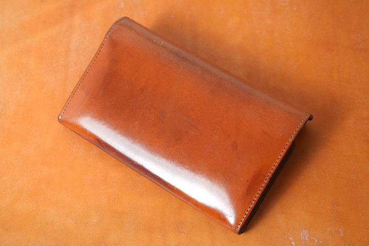 ・弊社製品は縫製の始点と終点の糸が抜けないように熱処理を行いますが、ブライドルレザーなどのワックス成分を含む皮革の場合には、周囲の粉状のワックス(ブルーム)が溶けることで粉状ではなくなり、その部分だけ革本来の色味が見える状態になることがあります。革自体に影響がある程の熱ではございませんが、ワックスは融点が低いためにこのような跡になり、またブルームの量が多い個体ほどより顕著に現れます。