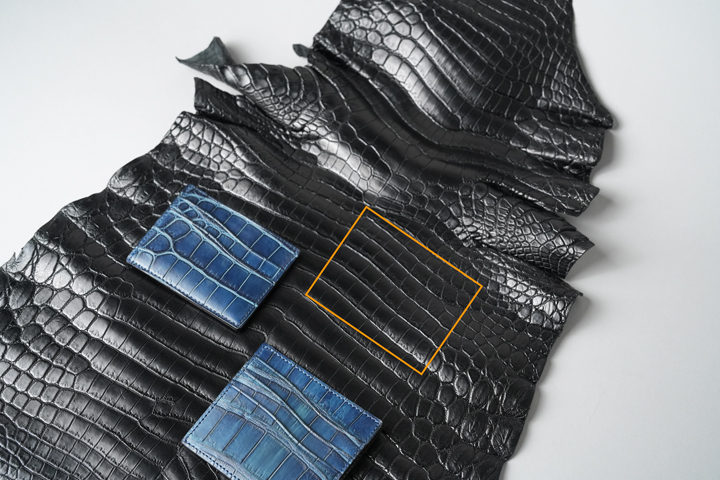 具体的な変更点は後ほどお伝えするとして、両モデルに共通するこだわりをご紹介します。まずはこちらの画像、クロコダイルの模様にご注目ください。すべてのパーツにおいてクロコダイルの頭を上にした縦方向に裁断しており、均整のとれた模様になると同時に、ずらりと並んだ鱗が一層の迫力を出しています。福田氏の発案による、贅沢かつこだわりの裁断方法です。