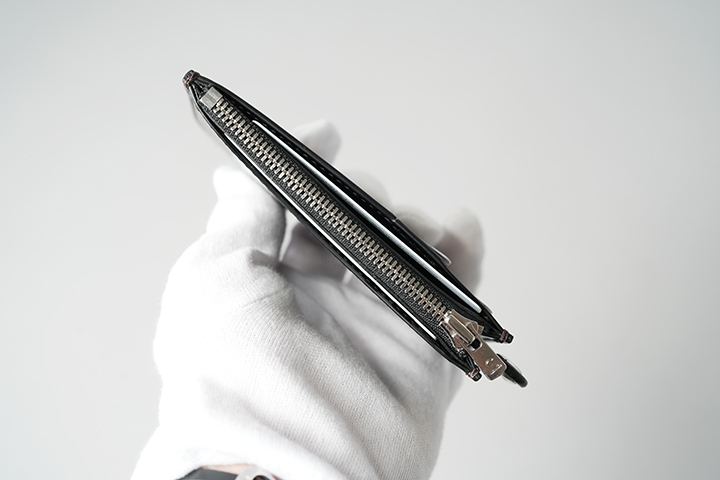 フラットでポケット等の付属パーツはなく、プレーンな外観です。メイン収納部の前身側には、FRAGMENTを収めることができます。札室とカード収納スペースも設けられ、札室は一万円札がほぼジャストで収納できるサイズ感です。カード収納部は収納枚数よりもスムーズな操作性を重視しました。こちらで収まり切らないカードは、後にご紹介するFRAGMENTにも収納できます。またカード収納がついたスペースは、主にスマートフォンを収納していただく目的で設計しており、スマートフォンを収納した状態で同じスペースに紙幣を収納して頂くことも可能です。
