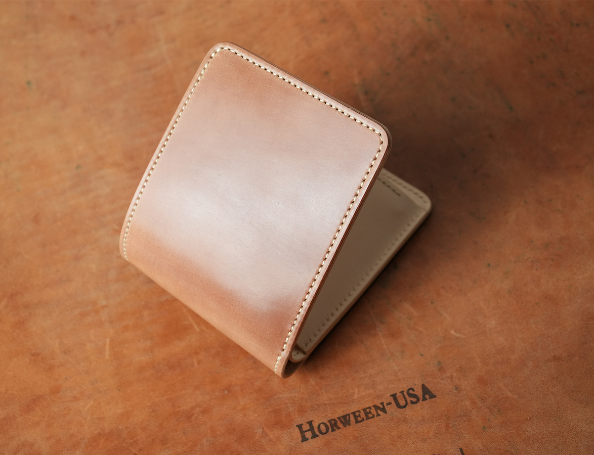 ※こちらで使用するシェルコードバンとサドルプルアップはどちらも無染色で仕上げていますが、原皮由来のキズ、シミ、シワ、血筋、色ムラなどが他のカラーに比べて目立ちやすくなります。また、こちらに加えてどちらもタンニン鞣しで仕上げているため、皮革生産時などに水分に含まれる鉄分に反応して生じる黒いシミのようなものが現れる部位があります。どちらも皮革ならでは特性となりますので、ご購入の際は予めご了承ください。