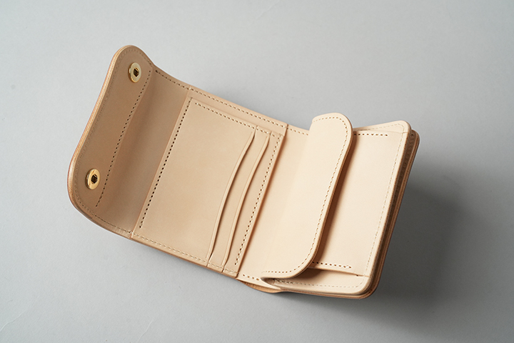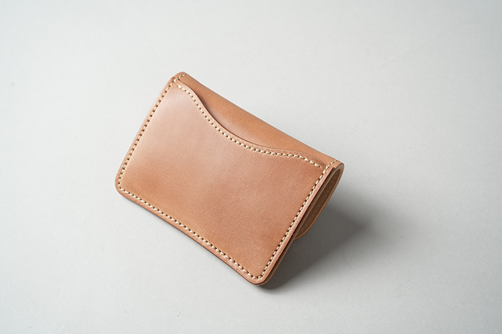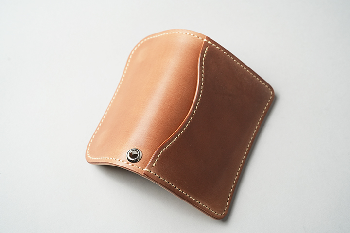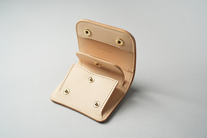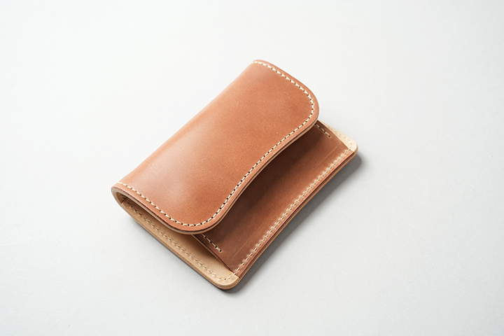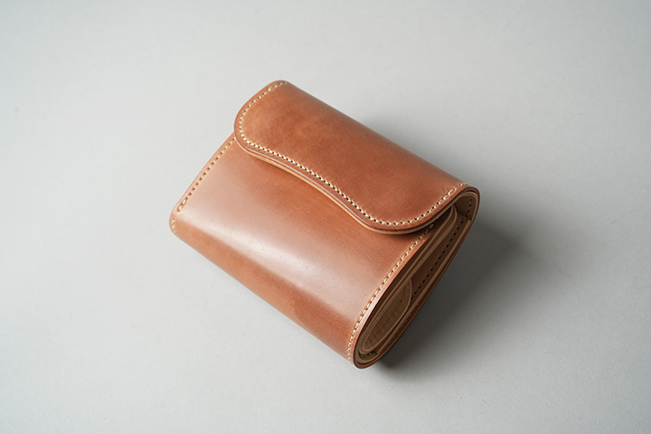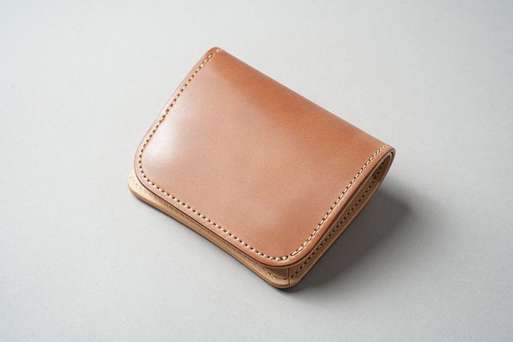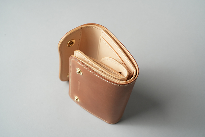 今回のラインアップの中では一番ボリュームの大きなENOですが、ボリュームがあるからこそ生み出せるシェルコードバンの重厚な艶感は一見の価値ありです。一方、一定の携帯性を備えながら、コロンとした見た目により非常に親しみのあるディテールがENOの大きな特徴となります。サドルプルアップの内装には所狭しとパーツが並び、十分なカード、コイン、紙幣が収納できます。