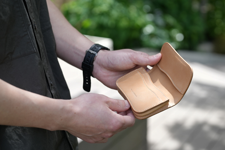 オーソドックスな二つ折り財布。頑丈で存在感のあるアイテムは、革を育てる楽しみもひとしおです。