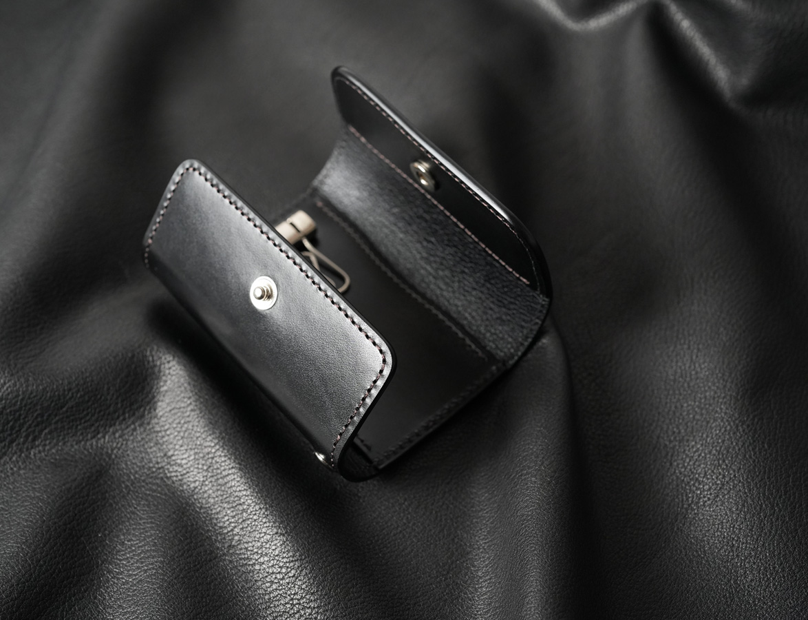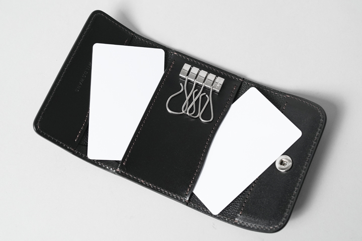 内装の4連キーフックはamiet社製のもので、向かって左側の大振りなキーフックは厚みのある鍵の収納を想定しています。キーフックの背面にはカードポケットを設けており、左右どちらからでも収納できる仕様です。フラップが開口部を覆うため、抜け落ちる心配もありません。プラスチック製のカードでしたら2枚ほど収納できますが、同時に収納する鍵の厚みによって枚数を調節してお使いください。