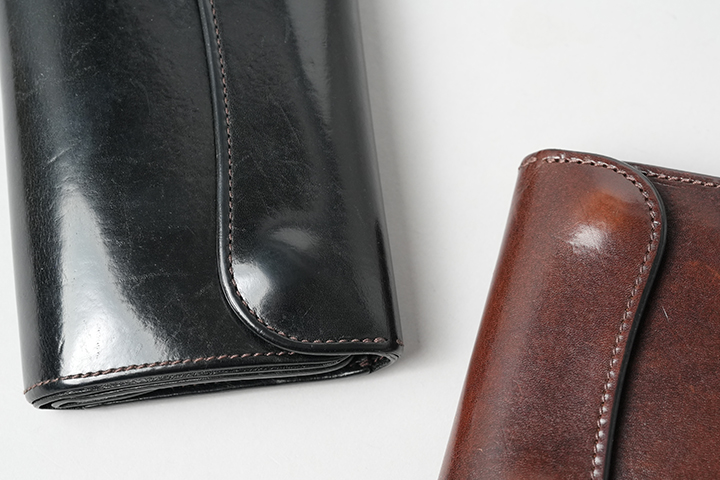 外装は一枚革をぐるりと巻くように形成されており、本体側面にはハトメが取り付けられています。フラップは1点のホックで開閉します。