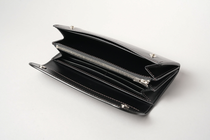 ファスナー式のコインケースを中心に、6段のカードユニットが2つ、2室の札室相当の大部屋、2室のマチ無しポケットを備えており、硬貨、紙幣、カードの他、チケットや領収書、通帳、パスポートを収納することが出来ます。