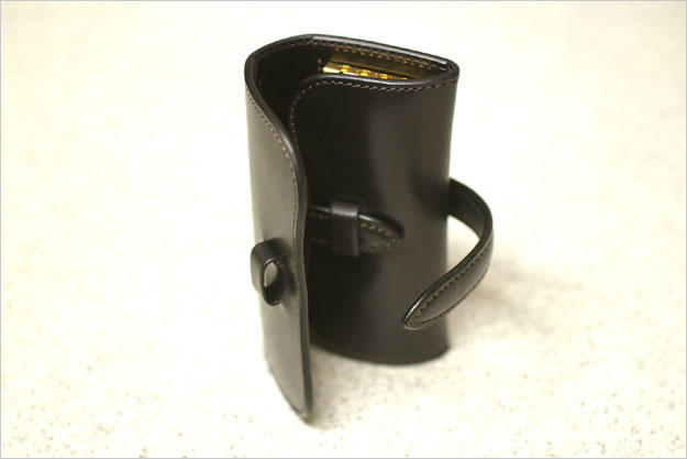 こういった細部の処理に革ならではの満足感があったりするのだと思いますが、使い勝手は置いといて(?)とにかく格好良いです。(手間のかかるストラップによる開け閉めというのは、ある意味「儀式」に近いのかも知れませんね。)