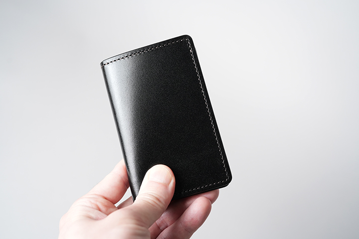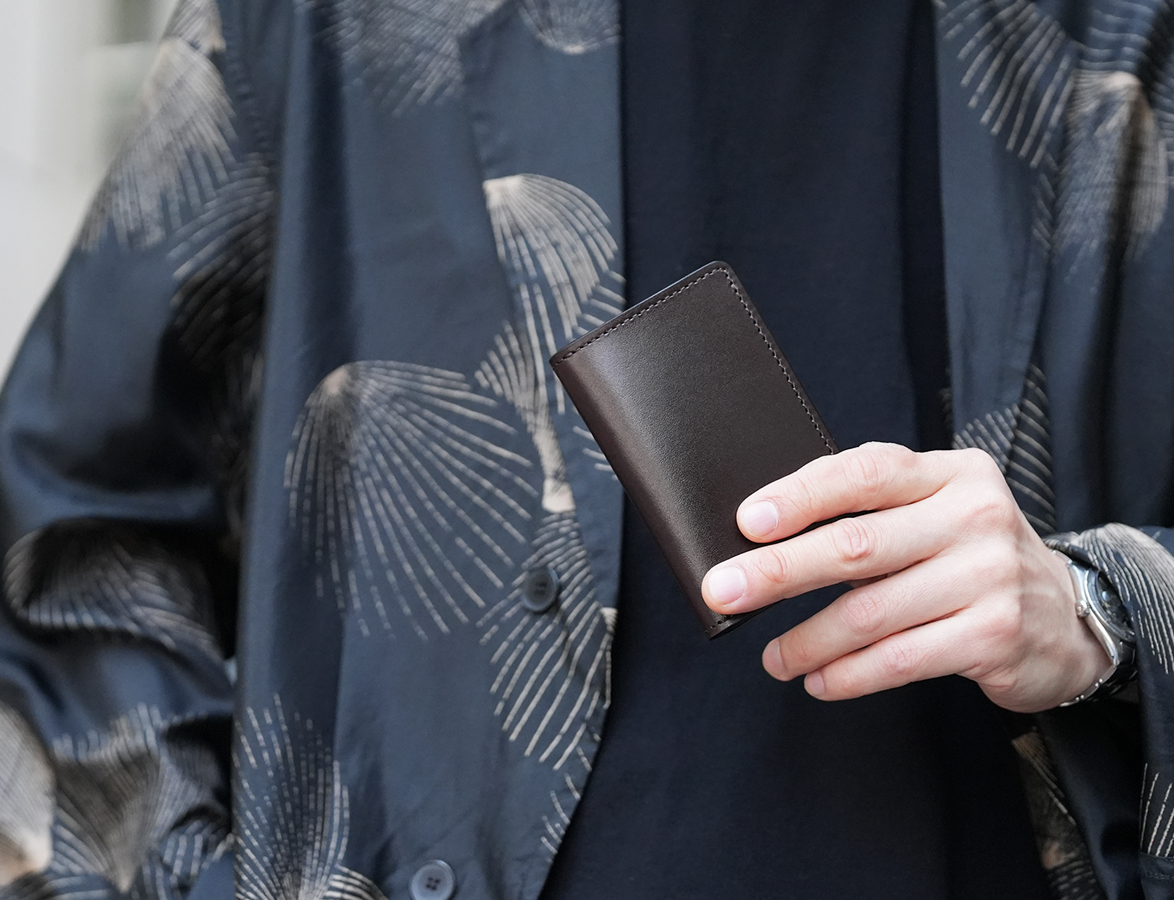 冒頭でもご紹介したようにADLERは、WILDSWANSがビジネスシーンを意識したディグニティーシリーズから派生したモデルであることから、通常WILDSWANS製品で見られるような本体の角の丸みが少し抑制されています。とても小さな部分かもしれませんが、このエッジによってキリっとしたスタイリッシュなディテールが形成されます。外装の背面にはTONGUEなどと同様にカードポケットを備えています。ポケットの上辺は、スムーズなカードの出し入れを実現する目的もあり、曲線を用いたディテールが採用されています。ADLER自体かなり小さなアイテムですが、財布など他のWILDSWANS 製品と同様に、職人が丁寧に磨き上げたコバが全体を引き締めます。そして実用面においても、この強く美しいコバが製品全体を強固にして長い時間の使用に耐え得るだけのフレームとして全体を支えるのです。