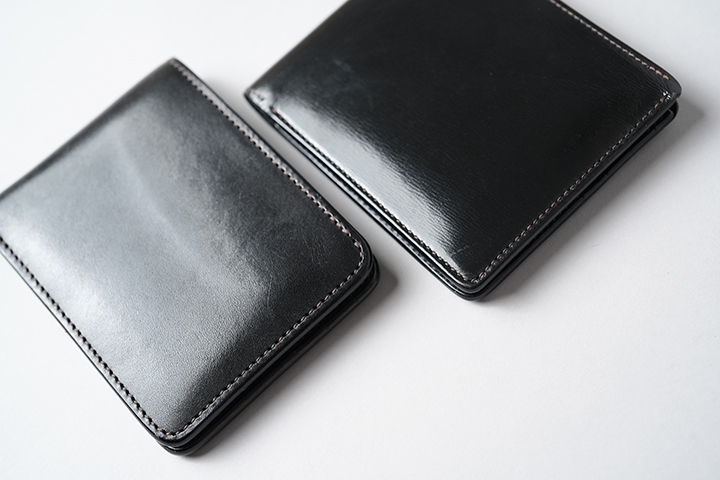 WILDSWANS が2009年に発表した「尊厳」や「品位」などを意味する”ディグニティー”シリーズ。従来のWILDSWANS のデザインとは異なり、角の丸みや厚みを抑えることでビジネスシーンを意識した意欲的なシリーズでした。当時、このシリーズにはMASLOW(マズロー)という薄型の名刺入れがありましたが、こちらの後継モデルとして2012年に誕生したのが今回ご紹介するADLER(アドラー)です。ADLERはこれまでも限定企画やスポット企画などで製作していきましたので馴染みのある方も多いかもしれませんが、今回はWILDSWANS の代名詞となるサドルプルアップバージョンでの登場となります。サドルプルアップはベルギー・マシュア社の牛革で、耐久性の高さを裏付けるような強いハリ感とタンニン鞣しならでは味わい深いエイジングが特徴の牛革です。意外にもこれまでADLERではサドルプルアップを全面に使用した仕様での製作が少なく、まさにWILDSWANS製品 として王道の姿での登場となる訳です。上の3枚目の画像では異なる二つ折り財布を並べています。右上にディグニティシリーズのCOCTEAU、左下にWINGSを並べています。角の丸みにご注目ください。