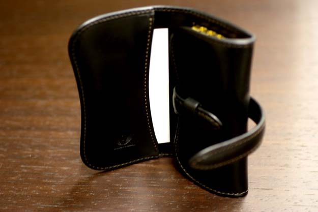 外側のストラップを外して本体を左側に開くとポケットがあります。ここには駐車券などが入れられるのですが、馴染むまでは本当に硬いので、お使い始めの頃は中々機能しないかも知れません。