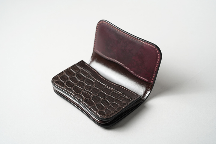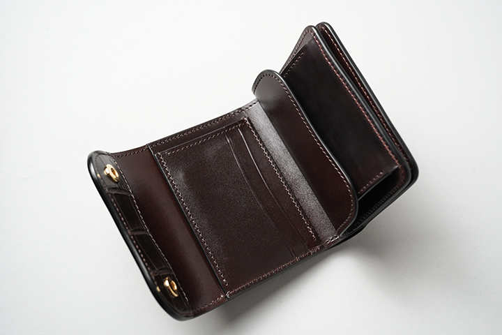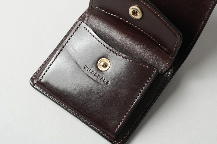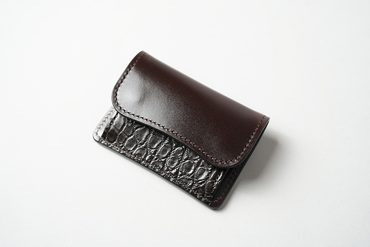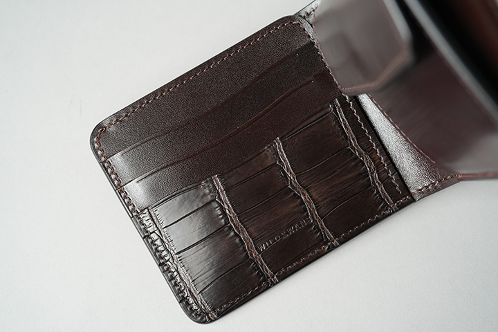 WILDSWANSのミニ財布では一番容量が多いCASA。優れたカード収納を備え、内装のフラップ背面には7~8枚のカードの収納が可能です。この他に札室やコインケースも装備しています。シェルコードバンはTONGUEと同様に外装背面のポケット、クロコダイルはフラップ裏の先端部分にあしらわれています。