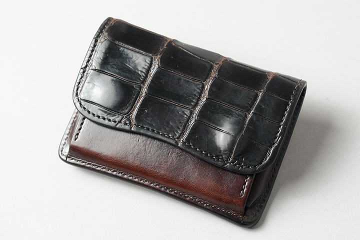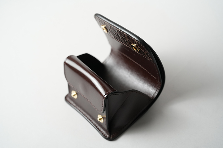 ブランドのアイコンとも言えるTONGUEは、コインケースの前身部分にクロコダイル、外装の背面にシェルコードバンがあしらわれています。GENERALと同様にとてもコンパクトなアイテムですが、1つのアイテムで3つの皮革を同時にお楽しみ頂けます。