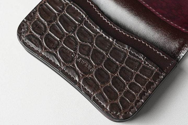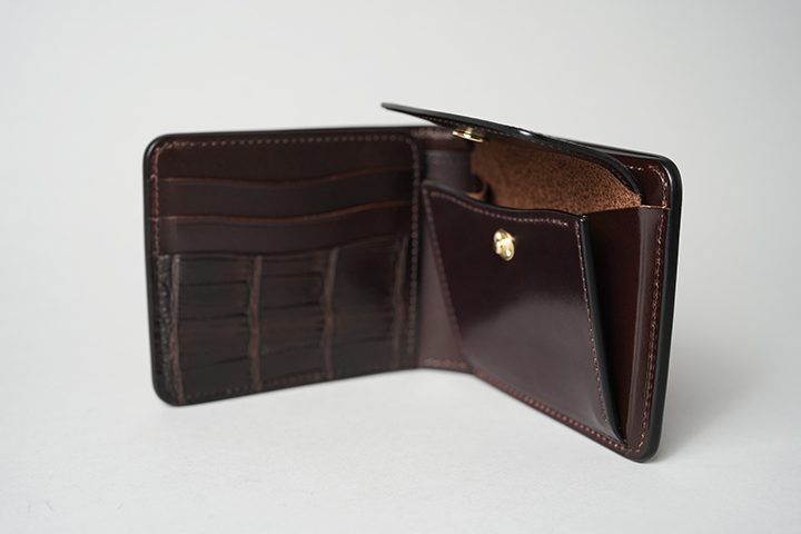 オーソドックスな二つ折り財布のGROUNDER。ご使用始めからどなたにも直感的な操作を可能にする定番アイテムです。サドルプルアップのみで仕上げた外装に対し、内装はコインケースの前身にシェルコードバン、カード段の一部にクロコダイルをあしらいました。