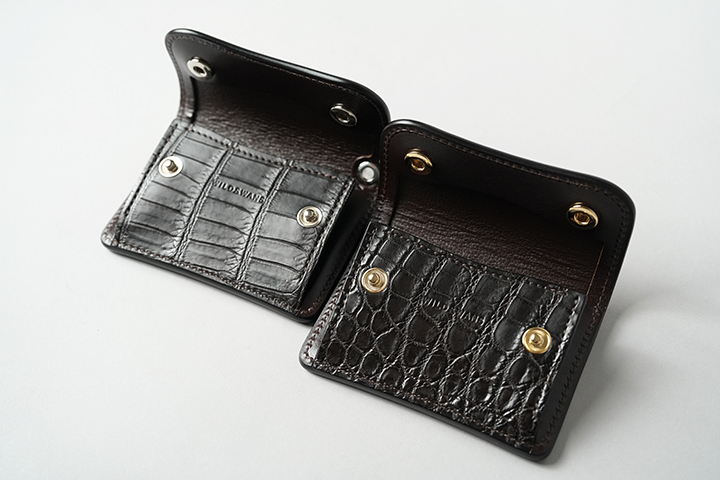 先にご紹介した2つのレザーに劣らない、高い耐久性を備えたクロコダイル。ブラックよりもソフトなイメージのチョコは、クロコビギナーの方でも扱いやすいカラーではないでしょうか。また、チョコカラーのクロコダイルは、使用することで黒っぽく変化していく面白い特徴があります。上の画像1枚目が使用前、2枚目が使用後3年のエイジングサンプルです。
