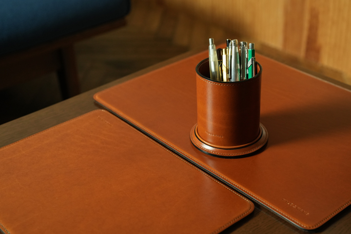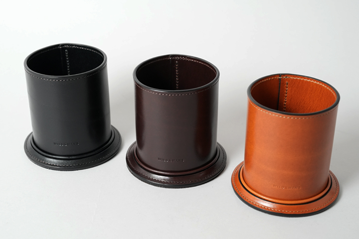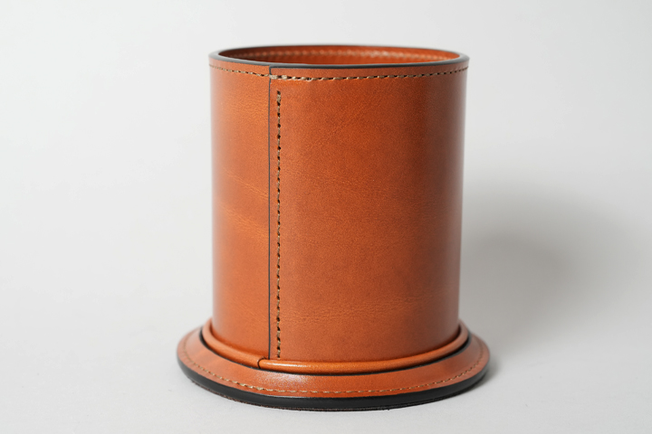 革を筒状に丸めた重厚感のあるペン立て。