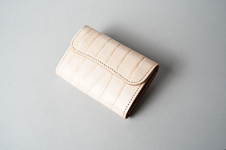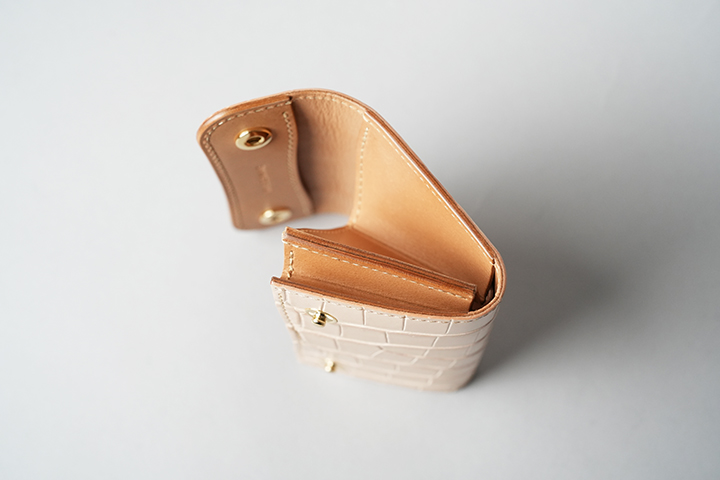 手のひらサイズでありながら、カード、紙幣、コインのすべてが収納できるCASA。外装は背面のポケットを含めてヌメクロコが一面を覆います。内装は一転してバスタン&フィスのヌメ革を用いた仕様です。ほのかに褐色を帯びた皮革を内装に用いることで、ゆっくりとエイジングが進みます。