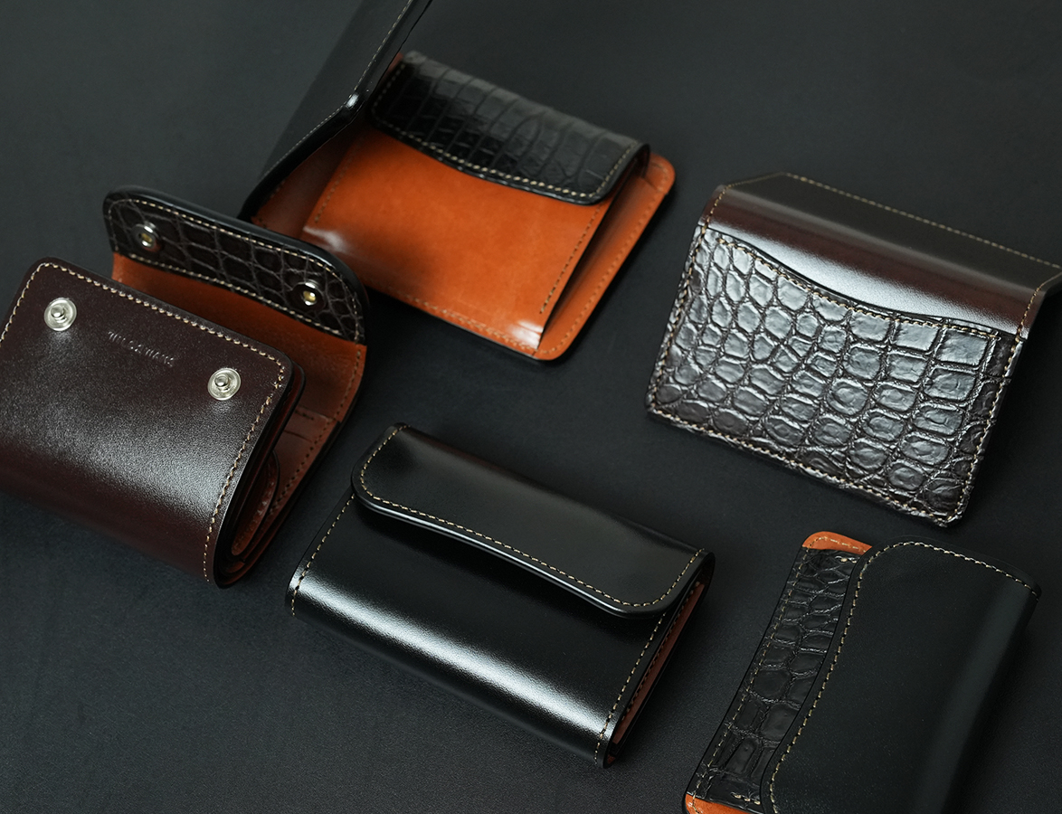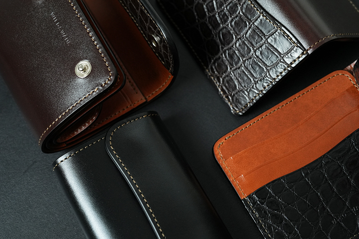 1つのアイテムで、複数の皮革や色をお楽しみ頂ける新しいシリーズがアソートレザーシリーズです。パーツごとの切り替えを多用することで、WILDSWANSでお馴染みのアイテムもいつもとは異なるユニークな顔を覗かせます。ブラックとチョコを基調にした2つのカラーバリエーションの中に、サドルプルアップのキャメルを共通して使用することによりエレガントなテイストをミックス。また、どちらのカラーバリエーションも糸色にはライトブラウン、金具にはシルバーカラーのホックを採用することで、各アイテムごとにバランスよくまとめ上げています。一方で、これまでに発売したトリプルレザーシリーズよりもクロコダイルを使用したパーツの数を2倍に増やすことにより、非常にリッチな仕上がりとなりました。