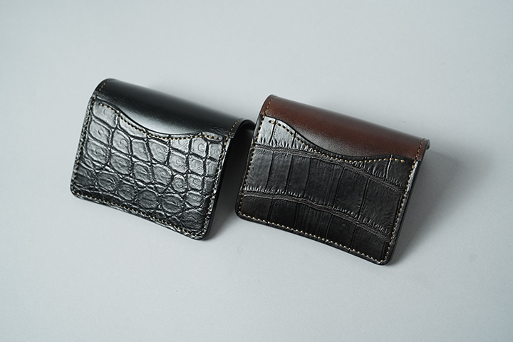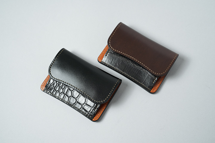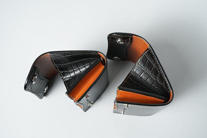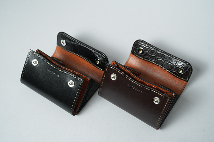 最初に登場するアイテムは、WILDSWANSでもっとも製作数の多いTONGUE。クロコダイルを背面ポケットと表側メイン収納部の前身に使用したダブルフェイスバージョンです。シリーズ中で唯一、外観から3素材のコントラストが美しく映える特別なコインケースに仕上がりました。カードは背面ポケットに1枚、メイン収納部の仕切りの後ろに2枚、100円硬貨ですと10枚程収納できます。
