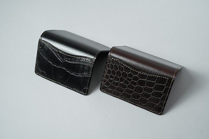 ライトブラウンのステッチが外装のアクセントになっているADLER。背面ポケットにはクロコダイルをあしっていますが、フラップのサドルプルアップと同色で組み合わせることで、フォーマルな場面でも対応できる名刺入れとなります。内装はサドルプルアップのキャメルをベースに、本体にL字で縫製をかけたあおりポケットにはクロコダイルをあしらいました。複数パーツにクロスダイルを用いることで、この皮革の様々な表情をお楽しみ頂けます。