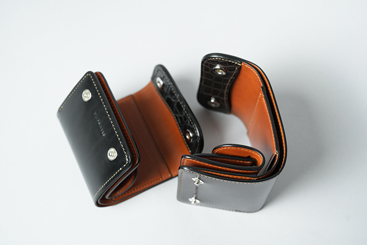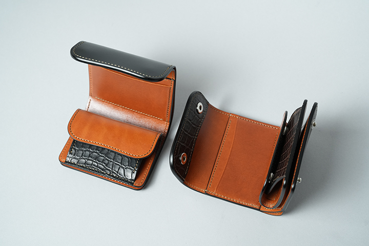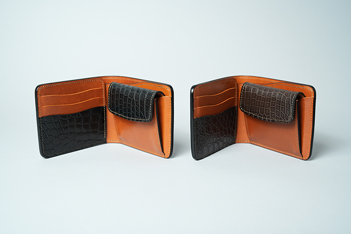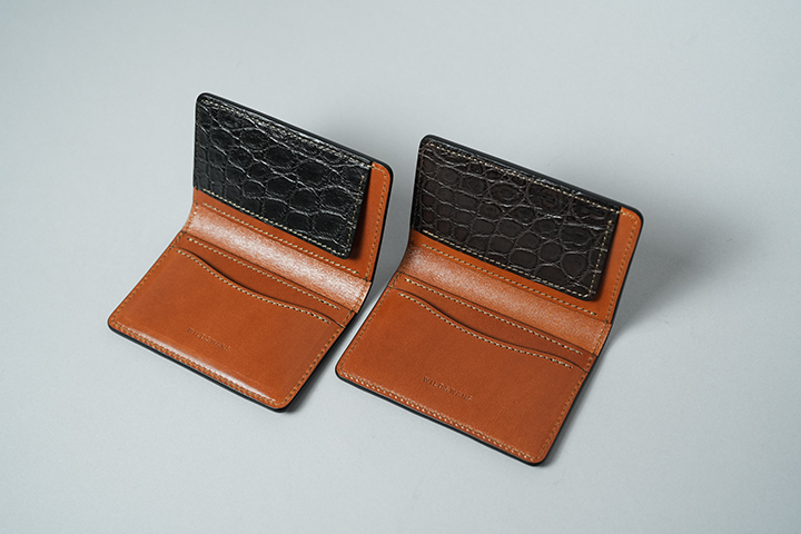 先頃発売となったばかりのPONTも当シリーズでも登場します。外装は単色のサドルプルアップの一枚革パーツですが、フラップを開けると内装は明るいキャメルを中心にクロコダイルパーツが立体的に現れます。PONTはカードやコインをメインに収納する方におすすめのウォレットです。紙幣は二つ折りでの収納ですが、近年は紙幣自体をそれほど使用しない方も増えていることから、携帯性を優先するのであればPONTが最適なウォレットになるかもしれません。