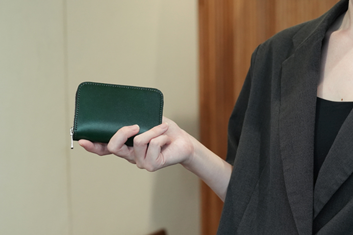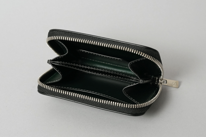 YKKのファスナーを備えたボックスのような出で立ちのウォレット。内装は細かく部屋が分かれ、小物を入れたりカードケースとしてもご使用いただけます。