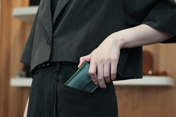 硬貨、お札、プラスチックカードを収納することができ、ズボンのヒップポケットにも入るミニ財布です。コインケースの裏にカードをまとめて収納できるよう最小限のパーツ配置に留めており、素早い操作感をお求めの方にピッタリのアイテムです。